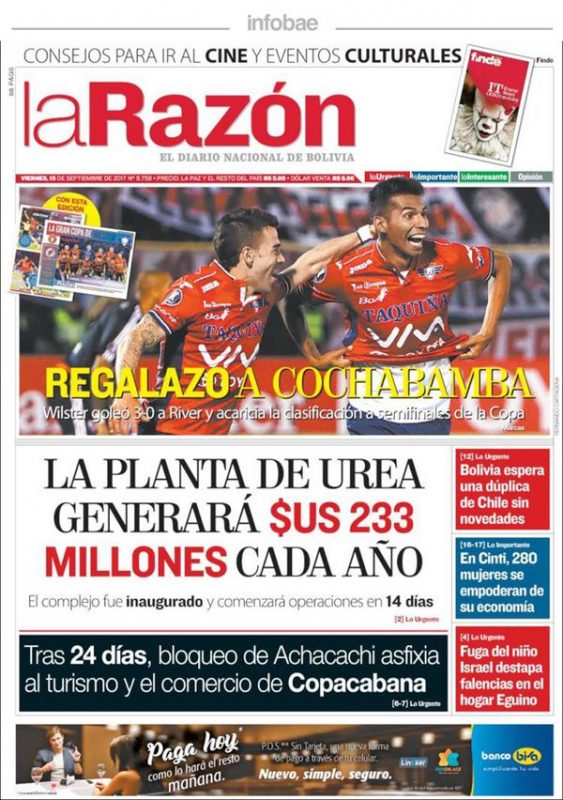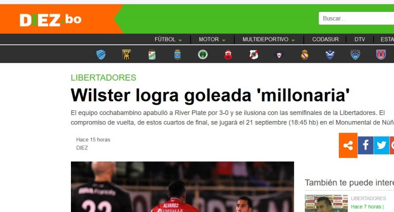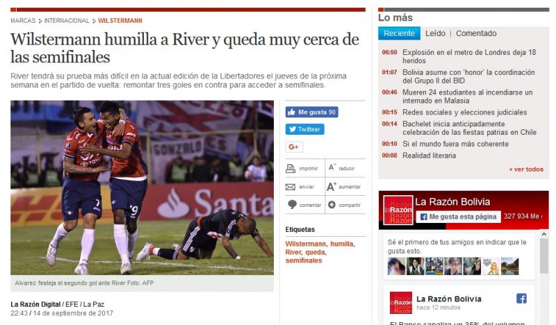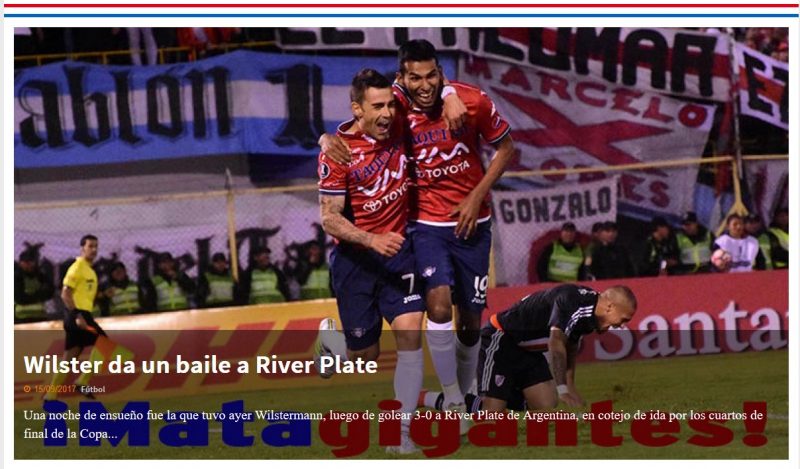 Distintos periódicos bolivianos destacaron hoy el “baile” que Jorge Wilstermann le propinó a River el jueves por la noche, al “aplastarlo” por 3-0 en Cochabamba por la ida de la Copa Libertadores.
