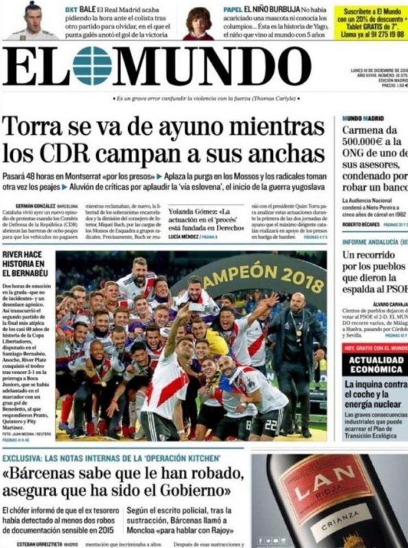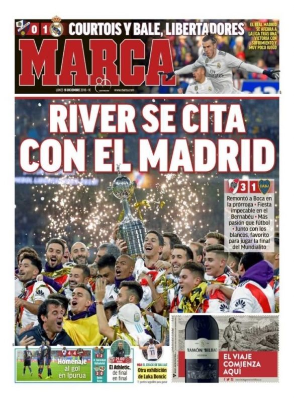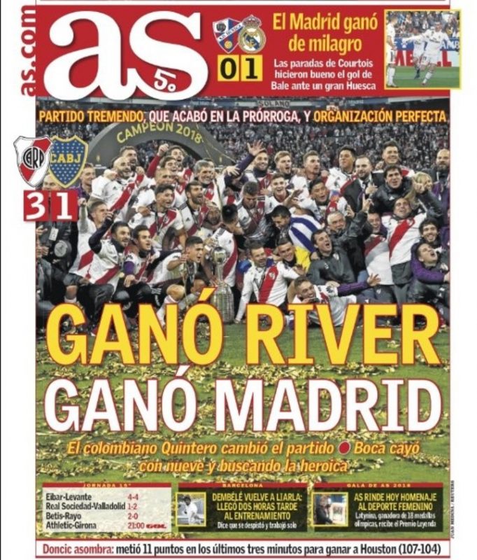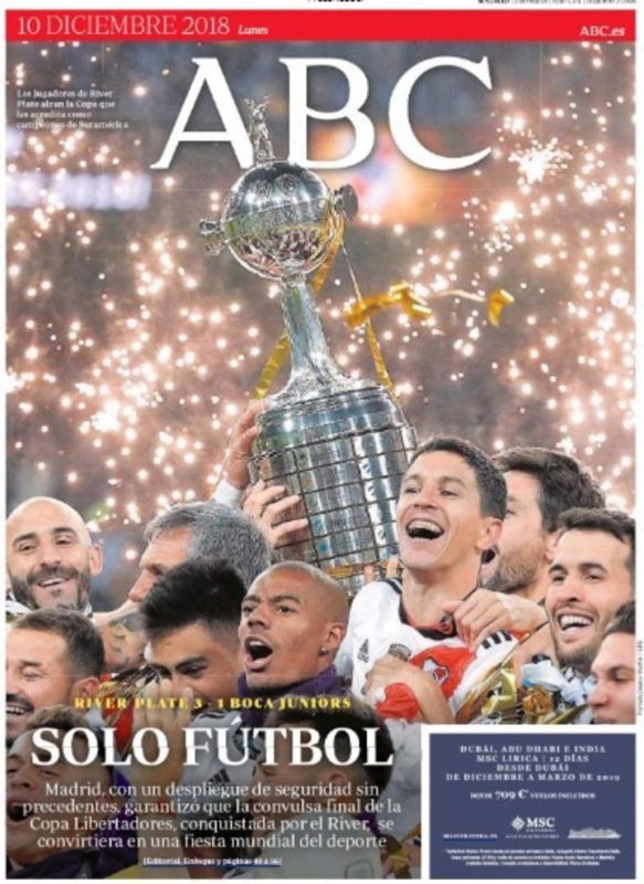 Los medios de prensa de España destacaron hoy en sus portadas el “ejemplar” comportamiento de los hinchas de Boca y River en la final de la Copa Libertadores de América jugada en el estadio Santiago Bernabéu, en Madrid, que permitió una “fiesta impecable” y sin ningún tipo de incidentes.