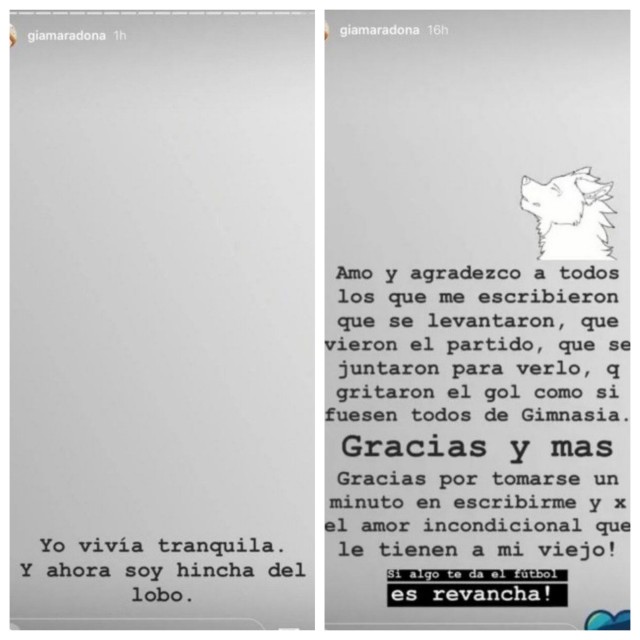 “Yo vivía tranquila. Y ahora soy hincha del Lobo”, fue el primero de los mensajes que escribió @giamaradona. Luego, subió otro mucho más extenso: “Amo y agradezco a todos los que me escribieron, que se levantaron, que vieron el partido, que se juntaron para verlo, que gritaron el gol como si fuesen todos de Gimnasia. Gracias y más gracias por tomarse un minuto en escribirme y por el amor incondicional que le tienen a mi viejo. ¡Si algo te da el fútbol es revancha!”.