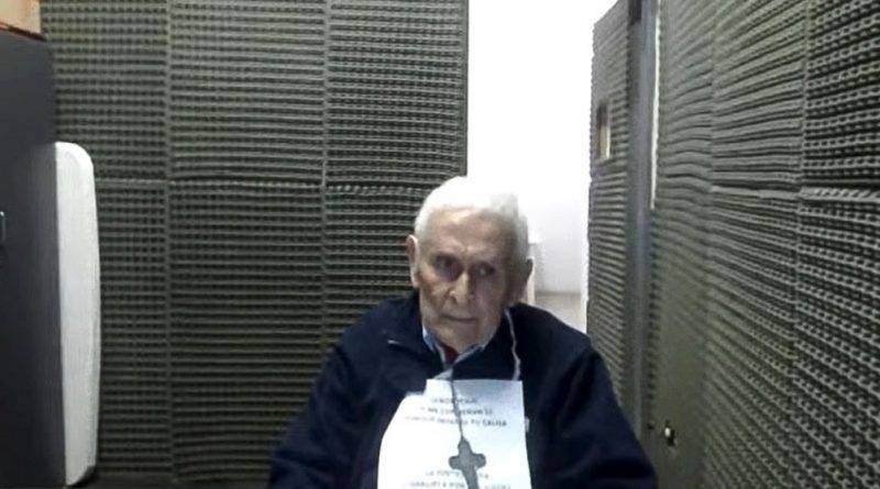 “Ustedes no son mis jueces naturales, están violando la Constitución Nacional”, dijo a los gritos el represor que, sobre un buzo color azul, llevaba colgado del cuello un cartel donde se leía “Señor Jesús si me condenan será porque defendí tu causa”.