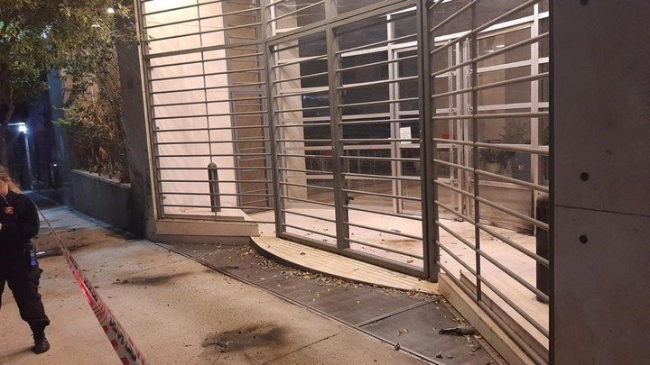 Los artefactos impactaron sobre la vereda y en la puerta del hall de ingreso al edificio de Clarín, provocando un principio de incendio. (Diario Clarín)