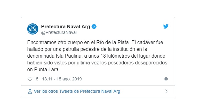 El hallazgo tuvo lugar cerca de la zona donde el miércoles fue encontrado el cadáver de Soria, el joven de 17 años con el que Martínez ingresó en aguas del Río de la Plata para pescar con trasmallos el pasado 2 de agosto.