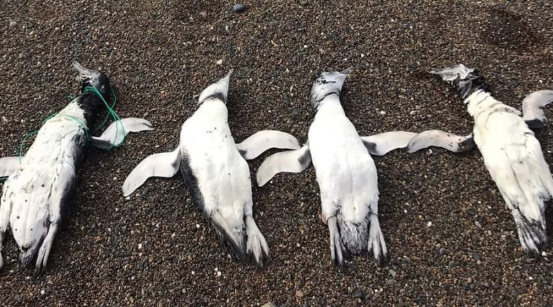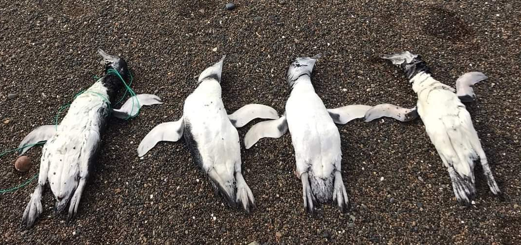 El hallazgo de los pingüinos de magallanes fueron reportados por la cuenta de Twitter @PlayaUnionRW, según la cual los cuerpos estaban con “cuerdas y residuos plásticos en su cuello”.
