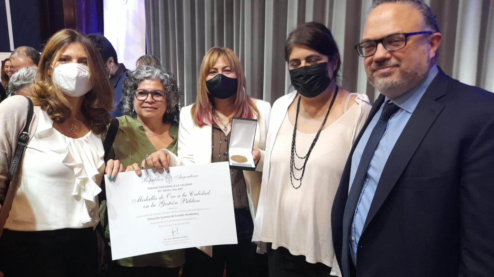 El Ministro de Desarrollo Productivo de la Nación, Matías Kulfas, junto a la Secretaria de Gestión y Empleo Público Ana Castellani, hicieron entrega esta semana de la Medalla de Oro a la Calidad en la Gestión Pública 2021 a la Dirección General de Gestión Académica de la Universidad Nacional del Sur.