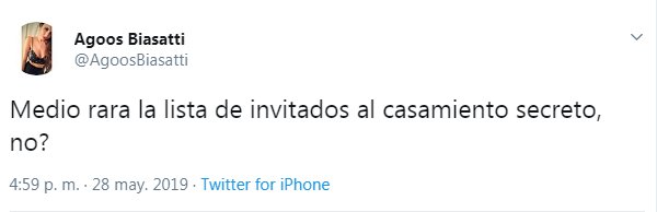 Solo una pequeña fracción de familiares directos estuvo invitada al civil. “Medio rara la lista de invitados al casamiento secreto, ¿no?”, tuiteó Agostina, la nieta de Santo, en horas de la tarde.