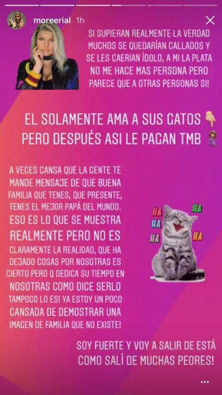“Muestra que es el mejor papá del mundo, pero realmente no lo es. Ha dejado cosas por nosotras, es cierto…pero que dedica su tiempo en nosotras como dice, tampoco es cierto. Ya estoy un poco cansada de demostrar una imagen de familia que no existe”, escribió la joven.