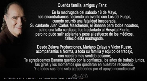 El ambiente de la cumbia argentina se despertó este sábado con una lamentable noticia: la muerte del cantante de “Los del fuego” Juan Carlos “Banana” Mascheroni, quien sufrió una falla cardíaca en medio de un show en Avellaneda. El deceso fue confirmado por Zelaya Producciones.