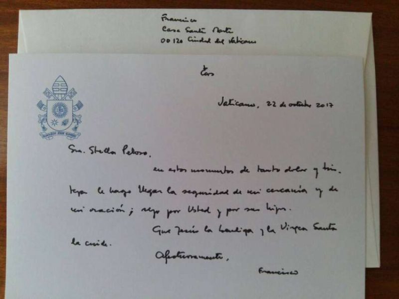 “En estos momentos de tanto dolor y tristeza le hago llegar la seguridad de mi cercanía y de mi oración; rezo por usted y por sus hijos. Que Jesús la bendiga y la Virgen Santa la cuide”, sostiene la breve misiva escrita por el jefe de la Iglesia Católica fechada el 22 de octubre.