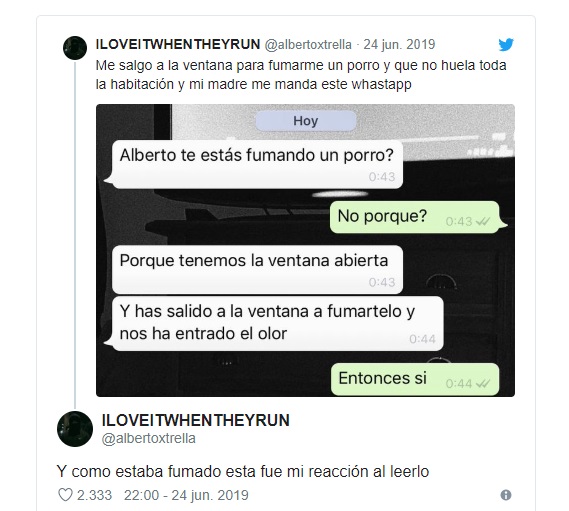 El usuario de Twitter @albertoxtrella (¿Portrella?) compartió una captura del breve pero franco intercambio que mantuvo con su madre a raíz del olor que produjo su cigarrillo de marihuana en la casa familiar en Madrid.