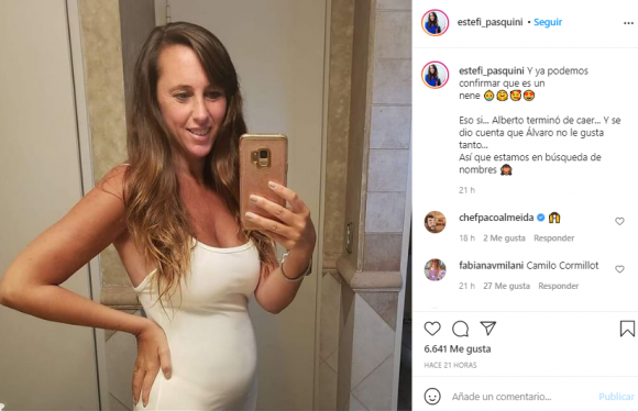“Y ya podemos confirmar que es un nene. Eso sí, Alberto terminó de caer y se dio cuenta que Álvaro no le gusta tanto. Así que estamos en búsqueda de nombres“, dijo la futura mamá en Instagram, mostrando de perfil la pancita en crecimiento.