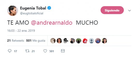 Desde su cuenta de Twitter, le escribió a su amigo cuando terminó su participación en Intrusos: “TE AMO @andrearnaldo MUCHO”, dejando muy en claro su apoyo a las palabras de Arnaldo sobre su relación con Cabré.