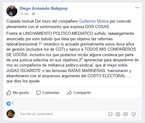 Exdirigente de la UOCRA local habló de “Judas” y de “ratas marineras que traicionaron”