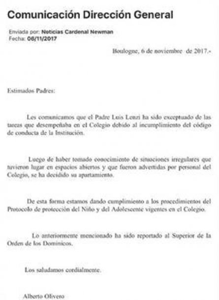 El Colegio Cardenal Newman separó al padre Luis Lenzi de sus funciones como confesor a raíz de haber sido encontrado en “situaciones irregulares” con estudiantes. Aseguran que al menos siete personas de la institución lo vieron “cometiendo imprudencias” con los chicos.