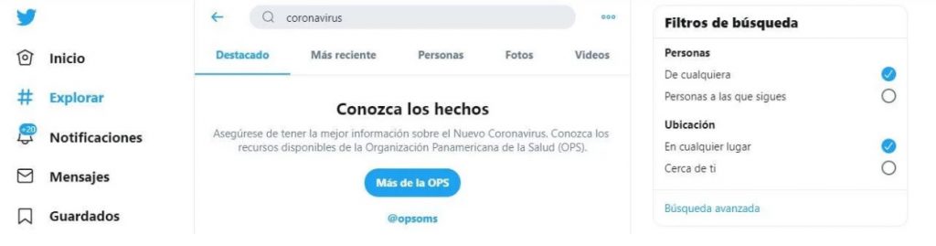 Tanto Twitter como Google implementaron una medida que, si bien no barre con la información falsa, sí puede ayudar a conseguir datos verificados. La mencionada red social dirige a recursos oficiales de organismos para el control y prevención de enfermedades. Por caso, cuando nosotros buscamos “coronavirus” apareció el siguiente mensaje al tope de los resultados, con un enlace al site de la Organización Panamericana de la Salud (OPS), tal como podés ver a continuación.