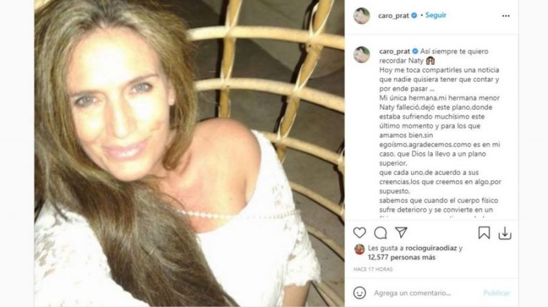 “Así siempre te quiero recordar Naty. Hoy me toca compartirles una noticia que nadie quisiera tener que contar y por ende pasar… Mi única hermana, mi hermana menor Naty falleció. Dejó este plano, donde estaba sufriendo muchísimo este último momento y para los que amamos bien, sin egoísmo, agradecemos, como es en mi caso, que Dios la llevo a un plano superior“, comenzó escribiendo Carolina Prat en su cuenta de Instagram, junto a una foto de su hermana.