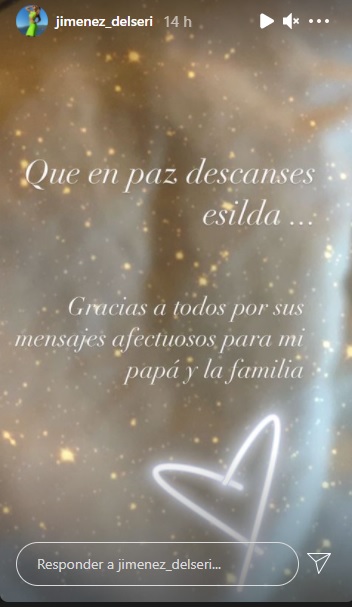 La noticia fue confirmada desde el entorno familiar. Natalia Jiménez, hija del cantante, lo comunicó a través de sus redes sociales con tiernas palabras para despedir a su abuela. “Que en paz descanses Esilda. Gracias a todos por sus mensajes afectuosos para mi papá y la familia“, manifestó la joven diseñadora en una historia de Instagram.