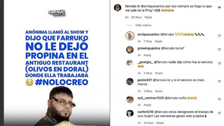 “Tenemos una anónima que dice que hay un artista que es horrible dejando tip (propina en inglés). ¿Quién ese artista tacaño?“, preguntó Santos al entablar la comunicación con la oyente. Y si bien en un principio la mujer se negaba a decir el nombre, finalmente lo compartió con el público: “¡Farruko!