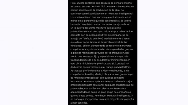 Si bien siempre todo se resolvió sin mayores complicaciones y sin necesidad de suspenderlas (funciones) gracias al plan de reemplazos previsto por la producción, hoy siento que lo más prolijo y especialmente lo que más tranquilidad me da a mí es adelantar mi finalización en esta obra, inicialmente prevista para el 4 de abril, y dedicarme exclusivamente a mi trabajo en MasterChef”, expresó.