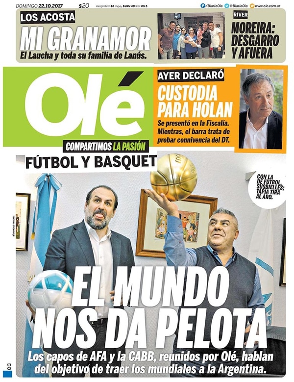 El presidente de la Confederación Argentina de Básquet y senador provincial Federico Susbielles aparece hoy en la tapa del diario Olé, junto al titular de la AFA, “Chiqui” Tapia. La nota completa, acá.