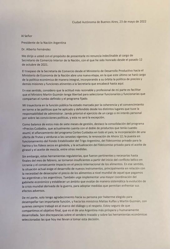 “En ese sentido, considero que la actitud más razonable y profesional de mi parte es facilitar que el ministro Martin Guzmán tenga libertad para seleccionar funcionarios y funcionarias que compartan el rumbo definido y el programa fijado”, sostuvo el funcionario saliente.