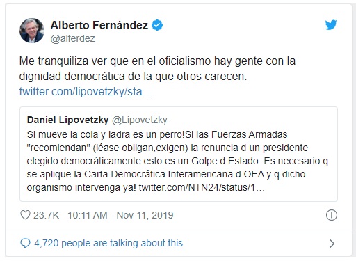 “Me tranquiliza ver que en el oficialismo hay gente con la dignidad democrática de la que otros carecen”, escribió Fernández en su cuenta de Twitter, al replicar un comentario de Lipovetzky referido a la renuncia del presidente Evo Morales y así diferenciarlo de la postura de la Casa Rosada, que ayer en un comunicado de la Cancillería evitó hablar de golpe de Estado.