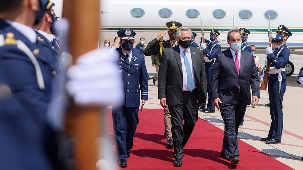 Acompañan al Presidente la primera dama Fabiola Yañez, el jefe de Gabinete, Santiago Cafiero; el canciller Felipe Solá, y los ministros de Salud, Ginés González García; y de Defensa, Agustín Rossi; los secretarios General de la Presidencia, Julio Vitobello, y de Comunicación y Prensa, Juan Pablo Biondi; la asesora presidencial Cecilia Nicolini y el embajador argentino en Chile, Rafael Bielsa.