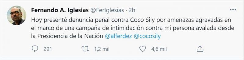 Cansado del tono prepotente de Sily, Iglesias decidió denunciarlo penalmente. Así lo confirmó en sus redes sociales, donde escribió: “Hoy presenté denuncia penal por amenazas agravadas en el marco de una campaña de intimidación contra mi persona avalada desde la Presidencia de la Nación”.