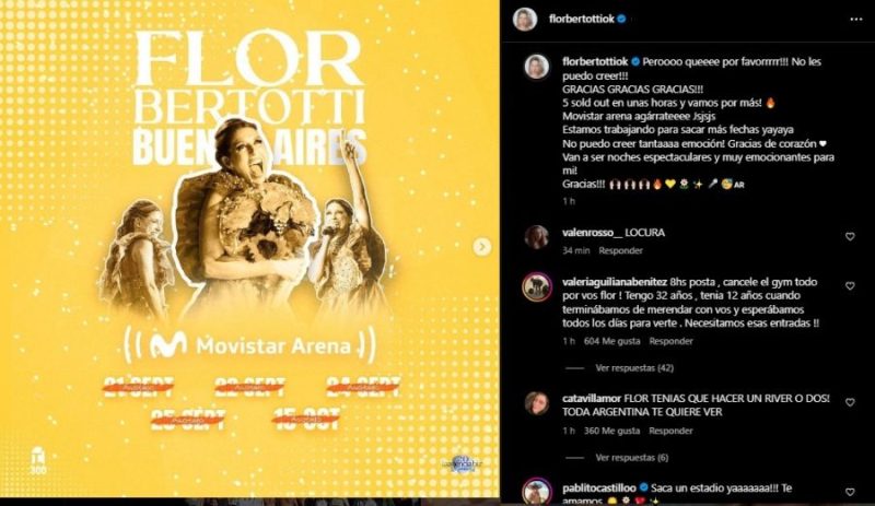 “No lo puedo creer. Gracias, gracias, gracias. 5 sold out en unas horas y vamos por más. Movistar Arena agarrate. Estamos trabajando para sacar más fechas yayaya. No puedo creer tanta emoción. Gracias de corazón”, escribió en un post.