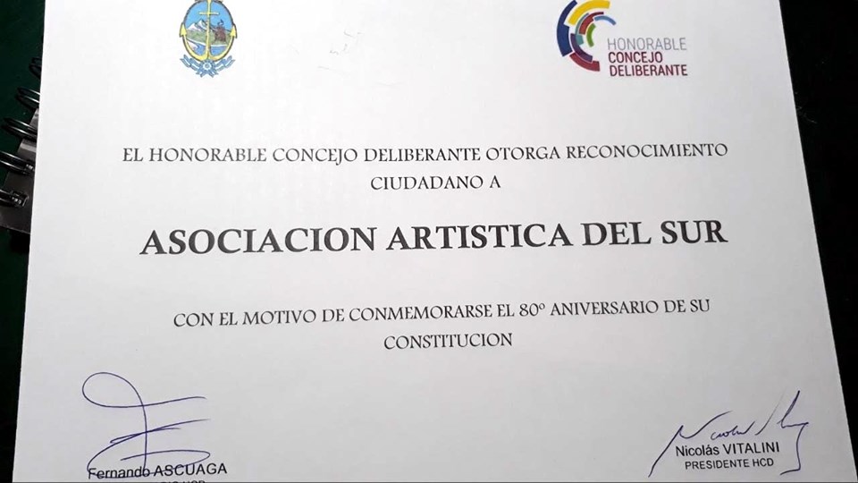 El Concejo Deliberante otorgó la distinción de “Reconocimiento Ciudadano” a la Asociación Artistas del Sur de Bahía Blanca con motivo de conmemorase el 80° Aniversario de su constitución. Este expediente fue aprobado por unanimidad del cuerpo, el pasado 6 de junio.