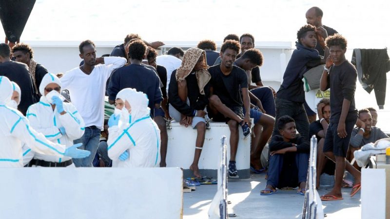 Ya cerca del barco, los marinos del remolcador constataron la presencia de “14 adultos y dos niños inmigrantes a bordo, todos aparentemente en buen estado de salud”.