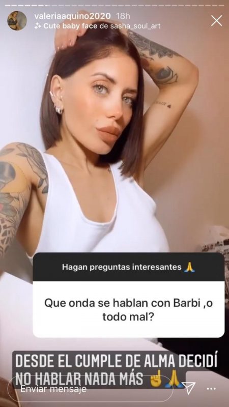 Luego fue consultada sobre el motivo de su pelea con la actual novia del cantante. “Le prometí a mi bella hija que no íbamos a hablar del tema. Más cuando hay niños de por medio. Eso sí que no me la vuelvan a tocar o mato a cualquiera“, contestó Valeria haciendo referencia a unos supuestos maltratos de Barby con su pequeña Alma.
