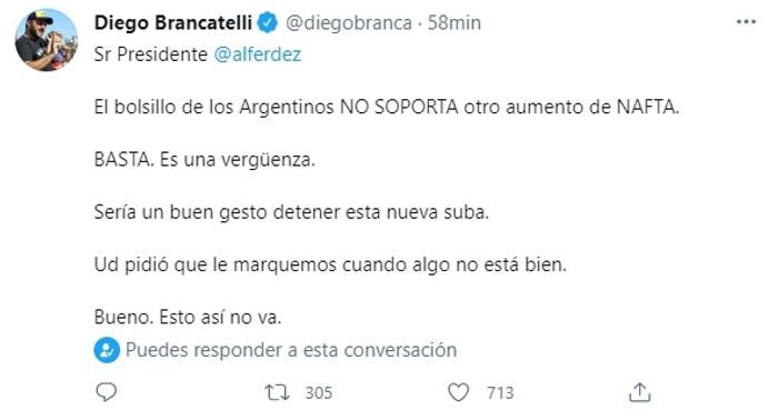 Sr Presidente @alferdez. El bolsillo de los Argentinos NO SOPORTA otro aumento de NAFTA. BASTA. Es una vergüenza“, indicó el periodista.
