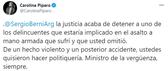 Al respecto, la diputada optó por volcarse en las redes sociales con el fin de referirse al exministro nacional. “@SergioBerniArg la justicia acaba de detener a uno de los delincuentes que estaría implicado en el asalto a mano armada que sufrí y que usted omitió. De un hecho violento y un posterior accidente, ustedes quisieron hacer politiquería. Ministro de la vergüenza, siempre”, escribió por medio de su cuenta de Twitter.