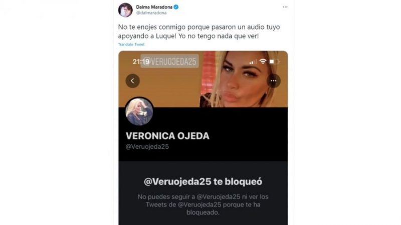 “No te enojes conmigo porque pasaron un audio tuyo apoyando a Luque, yo no tengo nada que ver“, añadió en otro posteo, donde mostró la prueba del bloqueo de Ojeda en la red.