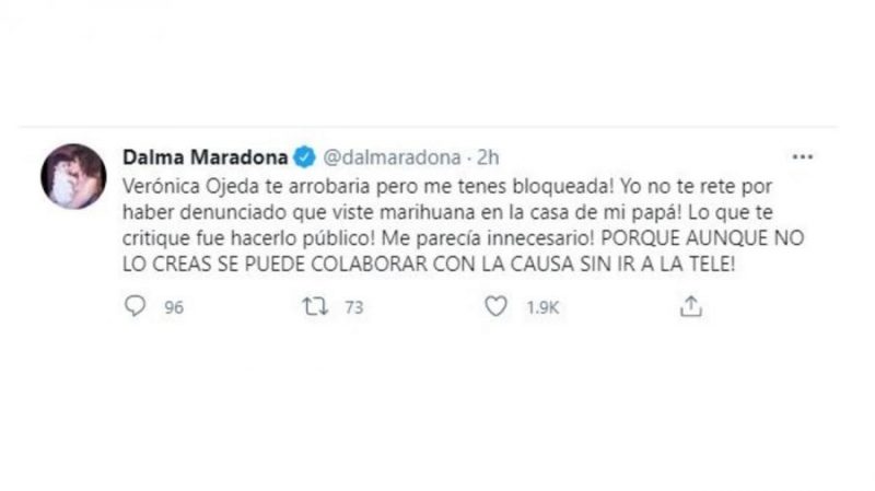 La respuesta de Verónica Ojeda no tardó en llegar. A través de un mensaje que envió a Polémica en el Bar, donde se encontraba su pareja, la madre de Dieguito Fernando lanzó: “¿Dalma por qué ocultó que su papá fumaba y me rompió las pelotas a mí por que yo lo conté? Ella me lo contó a mí, que sabía que su papá fumaba“, rezaba el mensaje que leyó al aire Mariano Iúdica, en referencia al consumo de marihuana de Diego Maradona.