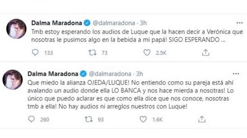 En otro tuit, agregó: “¡También estoy esperando los audios de Luque que la hacen decir a Verónica que nosotras le pusimos algo en la bebida a mi papá! SIGO ESPERANDO“.