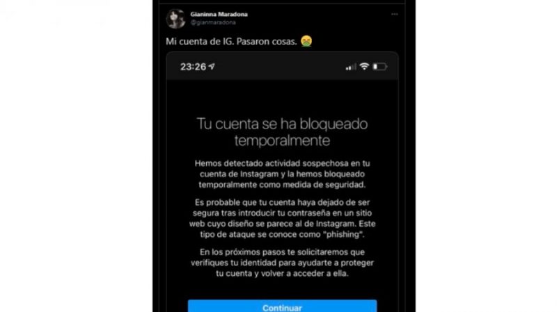 Mi cuenta de IG. Pasaron cosas”, escribió en Twitter la madre de Benjamín Agüero, junto a una captura que muestra cómo le bloquearon temporalmente su usuario tras detectarse una “actividad sospechosa”.