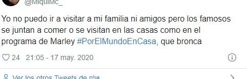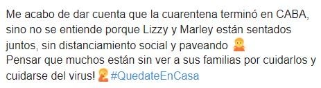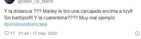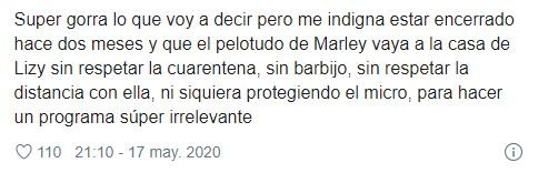 “Súper gorra lo que voy a decir, pero me indigna estar encerrado hace dos meses y que Marley vaya a la casa de Lizy sin respetar la cuarentena, sin barbijo, sin respetar la distancia con ella, ni siquiera protegiendo el micro, para hacer un programa súper irrelevante“, escribió un usuario, molesto por lo que veía en TV. En la misma línea, otra persona escribió: “¿Si Marley va a la casa de Lizy para hacer un programa. Yo puedo ir a la casa de alguien?“.