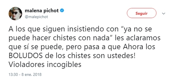 Sin mencionar a Castaña, Malena Pichot dijo: “A los que siguen insistiendo con que ‘ya no se puede hacer chistes con nada’, les aclaramos que sí se puede, pasa que ahora los boludos de los chistes son ustedes”.