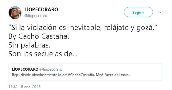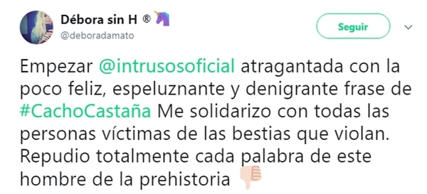 A él le siguieron el periodista Lío Pecoraro, que calificó de “repudiables” los dichos de Cacho, y la panelista de Intrusos Débora D’Amato, que se solidarizó con las víctimas de violación y dijo que las palabras del cantante eran “espeluznantes”.