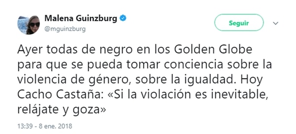 También opinó sobre el tema Malena Guinzburg, que contrastó la actitud de Cacho con la campaña que realizaron las actrices de Hollywood contra el acoso, por la que todas asistieron de negro a los Globos de Oro.
