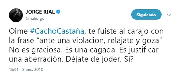 Jorge Rial fue uno de los primeros en repudiar los dichos de Castaña: “Te fuiste al carajo. La frase no es graciosa, es una cagada, es justificar una aberración, dejate de joder”, dijo el conductor de Intrusos a través de Twitter.