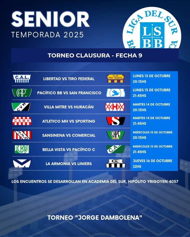 La Liga del Sur informó que esta semana se pone en marcha la fecha 9 del Torneo Clausura de Fútbol Senior.