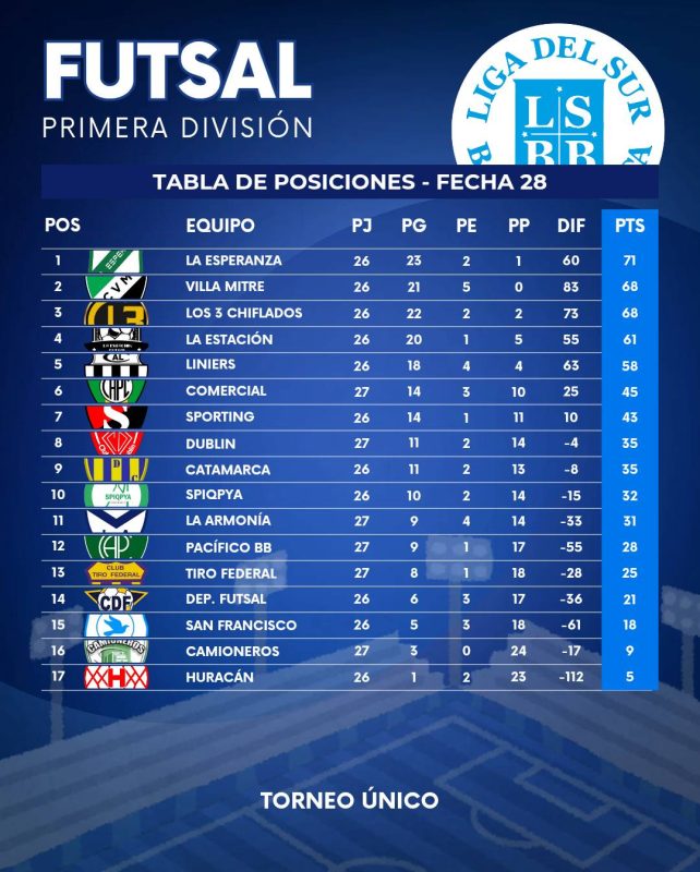 La Liga del Sur oficializó los resultados y las tablas de posiciones tras disputarse la fecha 28 del Torneo Único de Primera y Reserva del Futsal.