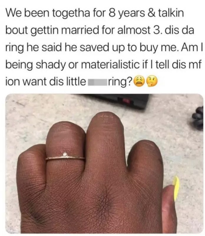 «Hemos estado juntos durante ocho años y hablando de casarnos por casi tres. Este es el anillo que dijo guardó dinero para comprarme. ¿Estoy siendo cruel o materialista si le digo a este desgraciado que no quiero este pequeño anillo?» dice la joven en la publicación.