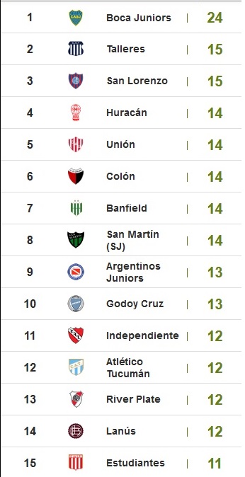 El Xeneize suma 24 puntos, con nueve de ventaja sobre Talleres, que igualó 1-1 con Racing Club, y San Lorenzo, que perdió 0-1 ante Banfield.