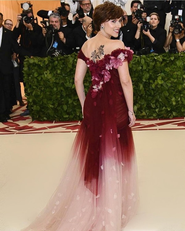 Scarlett Johansson con un vestido de Marchesa, la marca de Georgina Chapman, en la gala de MET.