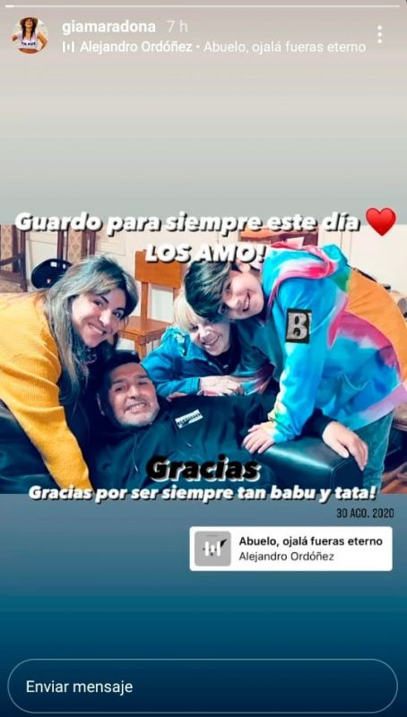 En esta oportunidad, la hija del Diez compartió en Instagram Stories una tierna foto familiar, en la que está Diego y Claudia Villafañe, mimando a su nieto, Benjamín Agüero. Gianinna también forma parte de la emotiva postal, que data del 30 agosto de 2020, según puntualizó la joven empresaria en la publicación. “Guardo para siempre este día. Los amo. Gracias por ser tan Babu y Tata“, expresó la joven.