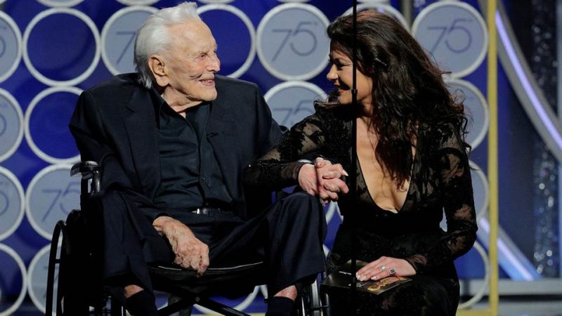 A los 101 años, el legendario Kirk Douglas protagonizó uno de los momentos más emotivos de la gala de los Globos de Oro 2018 . Fue cuando subió al escenario acompañado de su nuera, Catherine Zeta Jones , para presentar el premio a mejor guión de una película.
