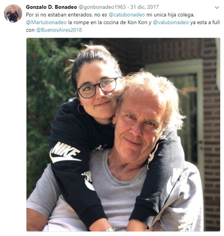 Pero lejos de confirmar o desmentir cualquiera de las versiones comentadas, el periodista decidió redoblar la apuesta y publicó una foto con otra de sus hijas que trabaja en el medio junto al siguiente mensaje: “Por si no estaban enterados, no es @catubonadeo mi única hija colega. @Martubonadeo la rompe en la cocina de Kon Kon y @valubonadeo ya está a full con @BuenosAires2018 (cuenta oficial de Twitter de los Juegos Olímpicos de la Juventud)”.